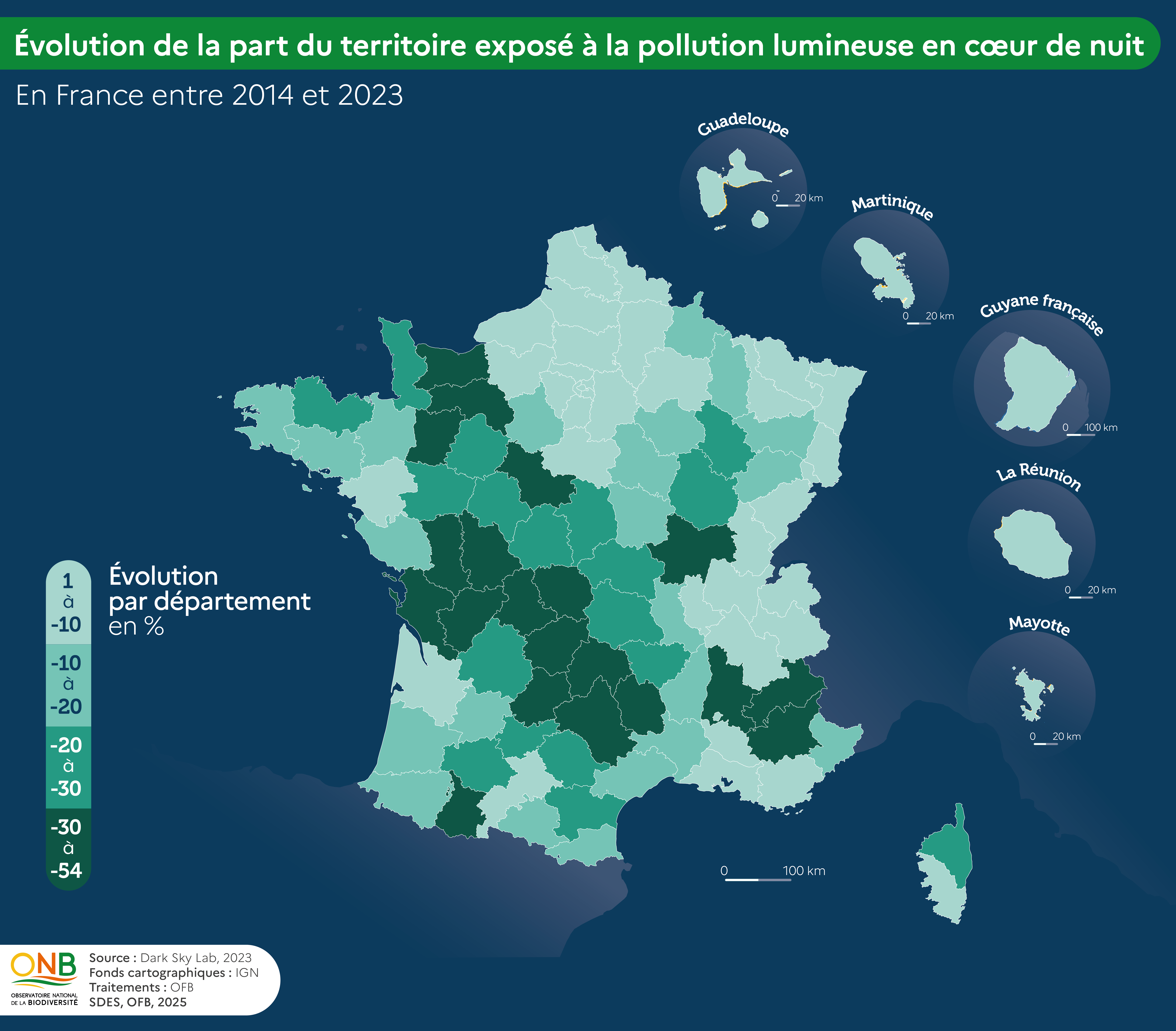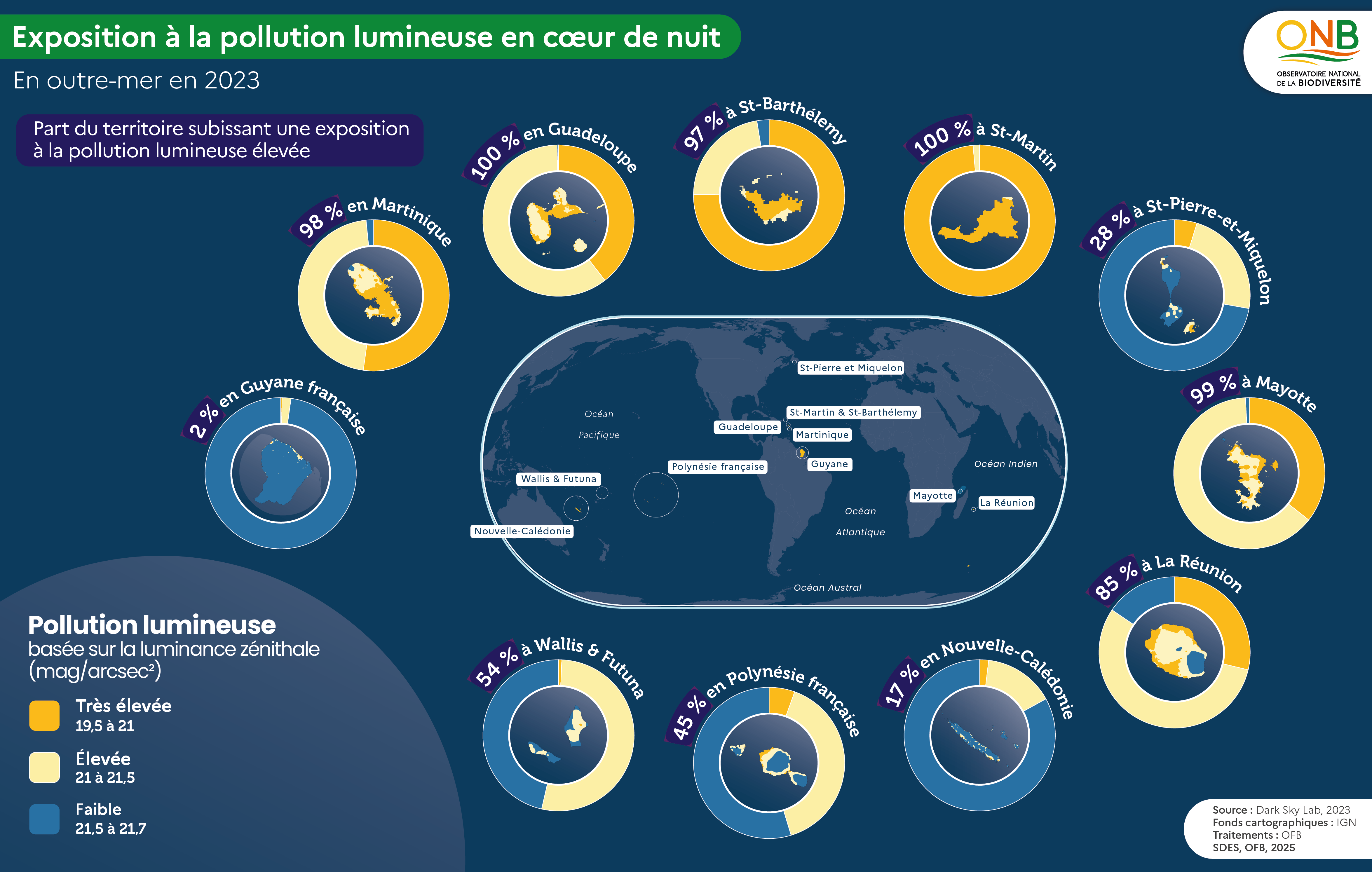 Cet indicateur a été réalisé dans le cadre de l’Observatoire national de la biodiversité par Dark Sky Lab avec l'appui de l'Office français de la biodiversité (OFB), ainsi que du Service des données et des études statistiques (SDES) du ministère en charge de l’écologie. Il traduit la part du territoire national fortement impacté par la pollution lumineuse, à partir de l’étude du phénomène de diffusion de la lumière dans l'atmosphère, révélée par l’imagerie satellite.