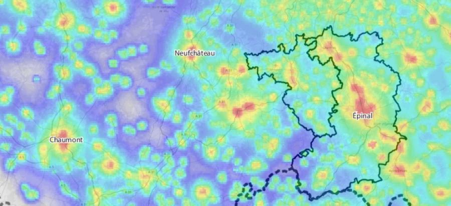 Le Scot des Vosges centrales couvre 154 communes, et ce territoire centré sur la ville d’Épinal compte plus de 130 000 habitants. Dans le cadre de sa révision, les élus ont souhaité en 2018 compléter la TVB, déjà bien définie, par une Trame noire. Cette étude a été réalisée par un consortium de trois bureaux d’étude : l’Atelier des territoires, spécialisé en environnement, Acere, expert en éclairagisme et DarkSkyLab spécialisé dans l’analyse de la pollution lumineuse.